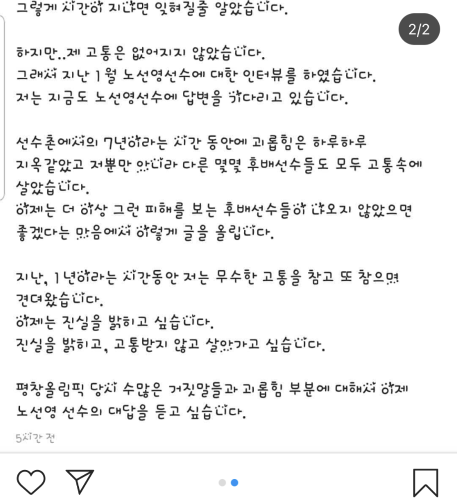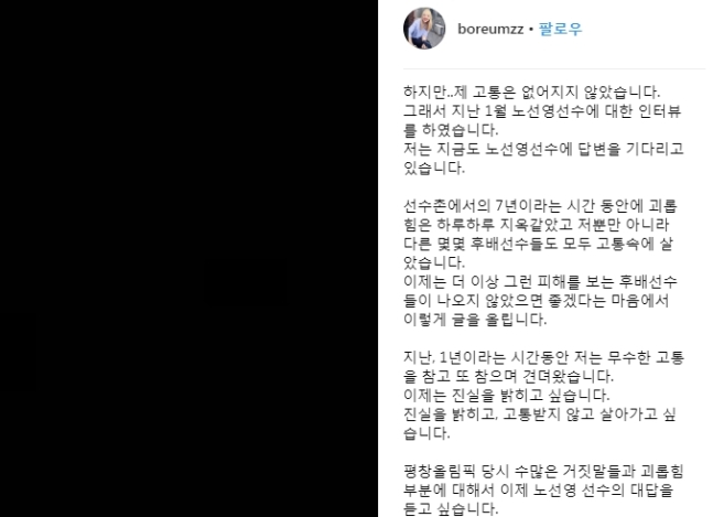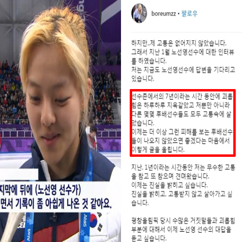 이후 노선영은 김보름이 항상 자신을 따돌림 시켰고 괴롭힘을 당하는 등 피해를 입어왔다고 주장했습니다.