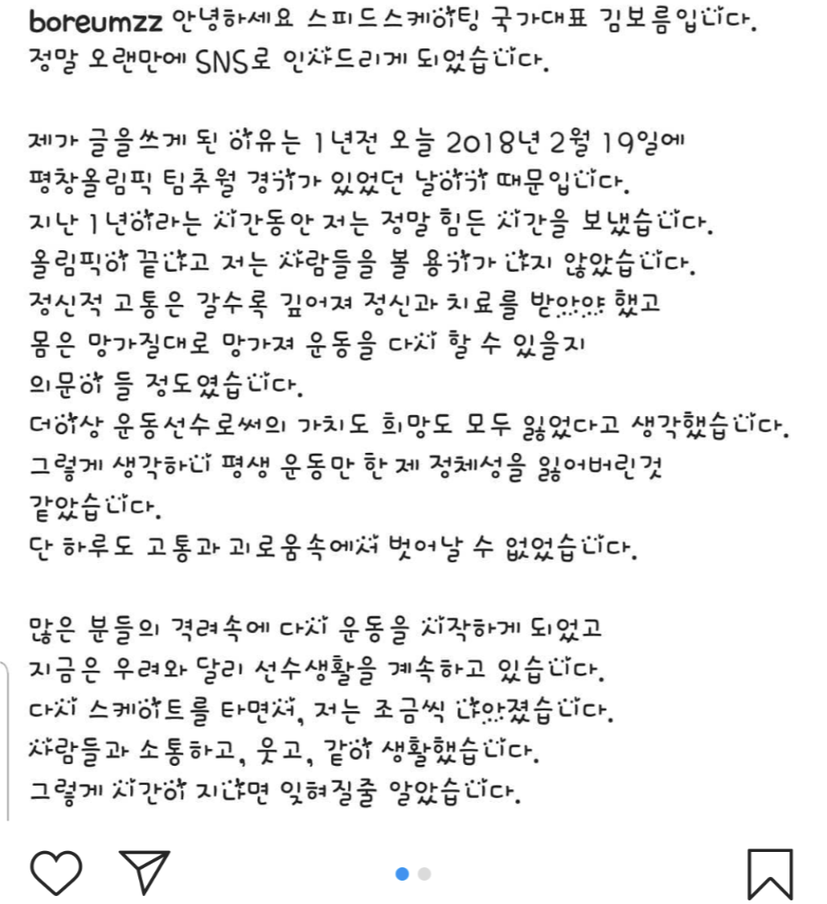 김보름은 대회 도중 기자회견을 열고 국민들에게 "죄송하다"며 사과하기도 했는데요, 그 후 정신과 치료와 함께 경기 준비를 하며 지낸 것으로 전해졌습니다.