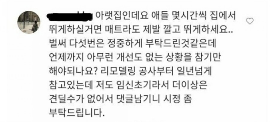 앞서 지난 11일 한 누리꾼은 이휘재 아내 문정원의 인스타그램을 통해 "아이들 몇 시간씩 집에서 뛰게 하길 거면 제발 매트라고 깔고 뛰게 하라. 벌써 다섯 번은 정중하게 부탁드린 것 같은데 언제까지 아무런 개선도 없는 상황을 참기만 해야 되냐"라며 "리모델링 공사부터 일 년 넘게 참고 있는데 나도 임신 초기라서 더 이상은 견딜 수가 없어서 댓글 남기니 시정 좀 부탁드린다"라고 댓글을 남긴 바 있습니다.