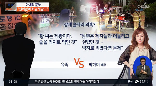 교통사고로 사망한 피해자의 유족은 "이게 대한민국이냐. 억지로 먹인 거다. 맨날 술만 먹인다는 말을 많이 들었다"며 울분을 토했습니다. 유족은 "(황민이) 술 먹고 운전한다고 걱정된다고, (하지만) 찍히면 출연을 못 하니까 참아야 된다고 말했다"면서 "왜 남의 아들을 술 먹고 죽이냐. 지나 죽지, 지는 살았다면서"라고 분통을 터뜨렸습니다.