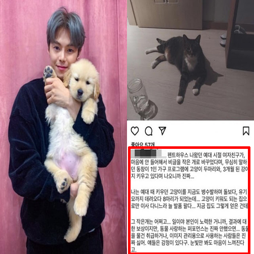 박은석의 서울예대 동기라고 밝힌 A씨는 "여자친구가 마음에 안 들어해서 비글을 작은 개로 바꾸었다며 무심히 말하던 동창이 1인 가구 프로그램(나 혼자 산다)에 고양이 두 마리와 3개월 된 강아지 키우고 있다며 나오니까 진짜... 그 작은 개는 어쩌고..."라고 의혹을 제기했습니다.