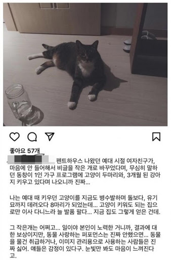 그는 "일이야 본인이 노력한 거니까 결과에 대한 보상이지만 동물을 사랑하는 퍼포먼스는 진짜 안했으면 좋겠다. 동물을 물건 취급하거나 이미지 관리용으로 사용하는 사람들은 진자 싫다"고 지적했습니다.