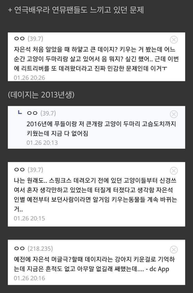박은석이 연극배우로 활동하던 시절부터 그를 지켜본 팬들조차 의문스럽다는 반응이었습니다. 한 팬은 "반지하에 함꼐 살던 고양이 두 마리는 어디로 간 건지 모르겠다. 2016년 토이푸들 로지도 키웠고, 2011년도에는 이사벨라라는 샤페이 종도 키웠다. 대형견 데이지도 있었다. 고슴도치도 있었다. 1~2년씩 키우다가 파양을 반복한 것처럼 보여 무섭다"며 과거 박은석이 올린 사진들 속 반려동물의 모습을 공개했습니다.
