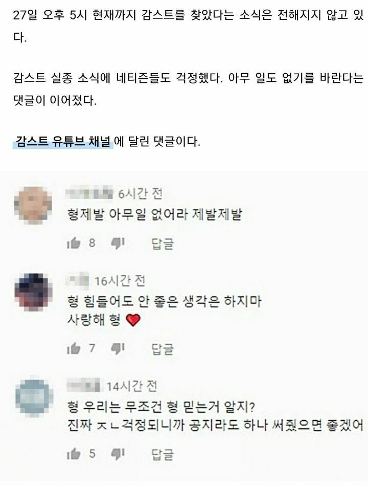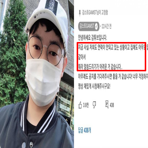 감스트 측은 지난 27일 감스트 유튜브 채널에 게재된 영상 댓글을 통해 긴급 공지 사항을 전달했는데요, 감스트 측은 "지금 사실 저희도 연락이 안 되고 있는 상황이고 집에도 아무도 없는 거 같아서 뭐라 말씀드리기가 어려운 거 같다"고 밝혔습니다.