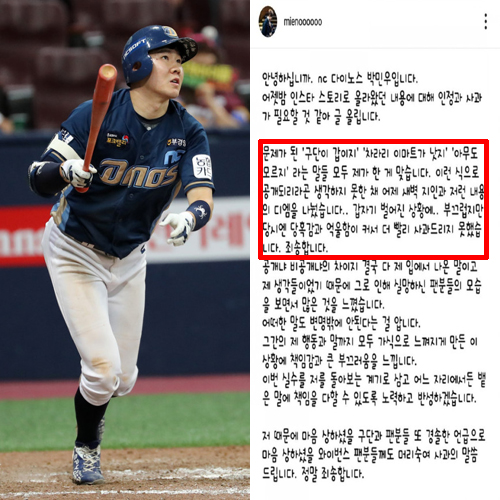 NC 다이노스 박민우가 SNS를 통해 부적절한 언급을 한 것에 대해 사과했습니다.