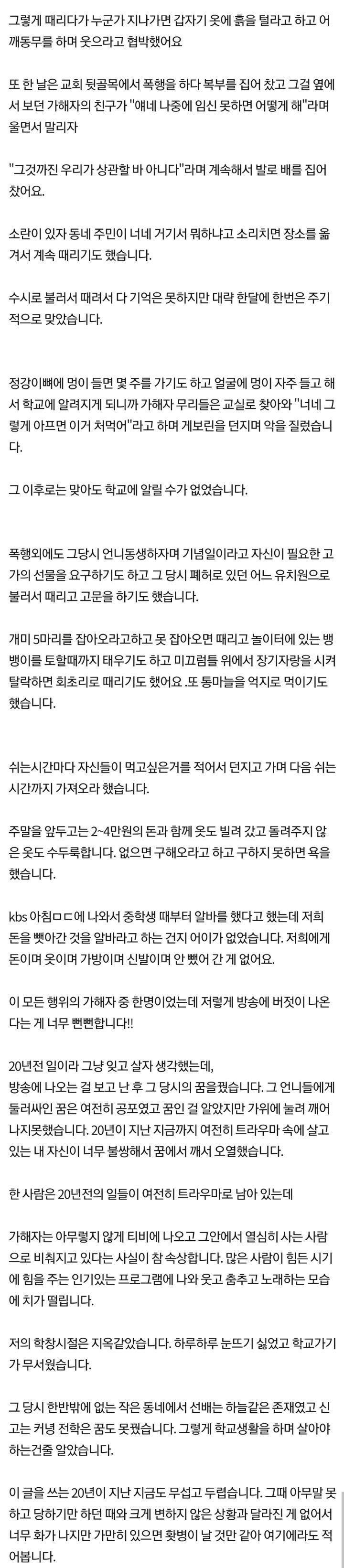 작성자는 "20년 전 저에게 학교폭력을 가했던 가해자 중 한 명이 아무렇지 않은 얼굴로 미스트롯2에 나온다"며 "잊고 지냈다고 생각했었는데, 얼굴을 보는 순간 그때의 기억이 스치고 모든 것이 그때로 돌아간 것 같다"고 말했습니다.