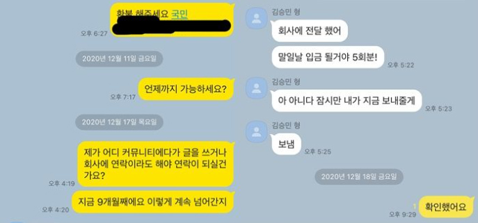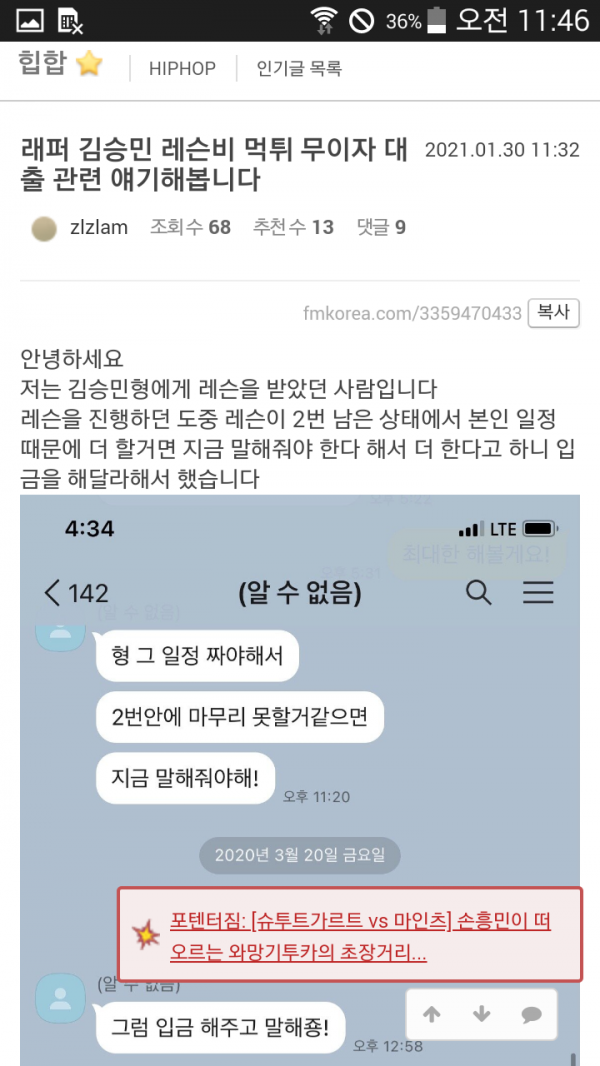 작성자는 "승민이 형은 9개월 동안 잠수를 타다가 제가 회사에 연락하거나 글을 쓴다는 한 마디에 1시간 만에 입금을 하고 사과 한 마디 없었다. 솔직히 너무 화가 났지만 그래도 좋게 생각하고 넘어가려 했는데 최근에 레슨생을 모집한다는 스토리가 올라와서 같은 피해자가 일어나지 않길 바라는 마음에 글을 쓴다"고 말했습니다.