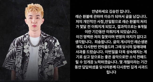 래퍼 김승민이 레슨비 '먹튀' 논란으로 물의를 빚은 것에 대해 사과했습니다.