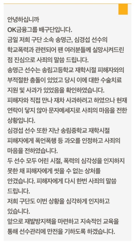 OK금융그룹은 "송명근 선수는 송림고교 재학 시절 피해자와 부적절한 충돌을 했다. 이에 대한 수술치료 지원과 사과를 했다는 것을 확인했다"며 "피해자와 직접 만나 재차 사과하려고 했지만, 현재 연락이 닿지 않아 문자메시지로 사죄의 마음을 전했다"고 밝혔습니다.