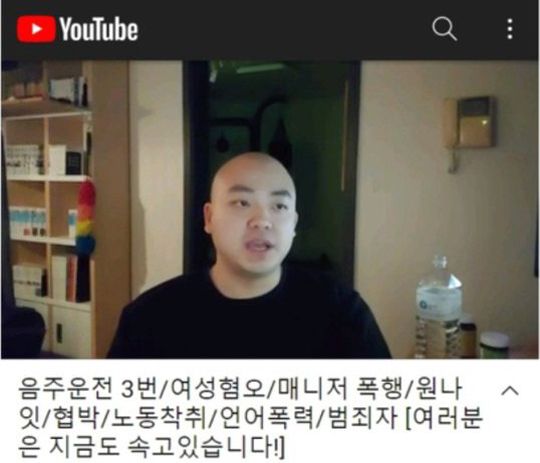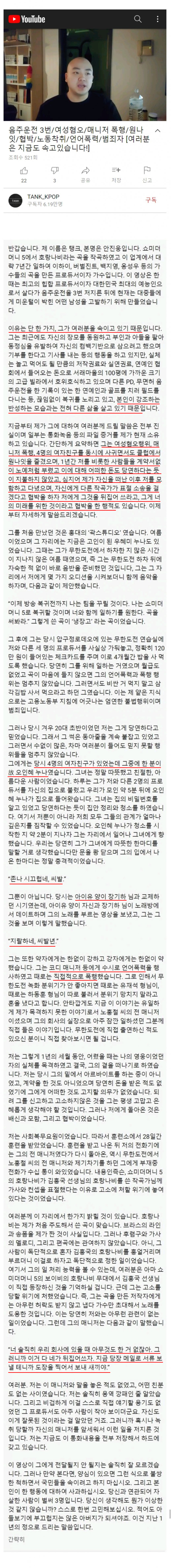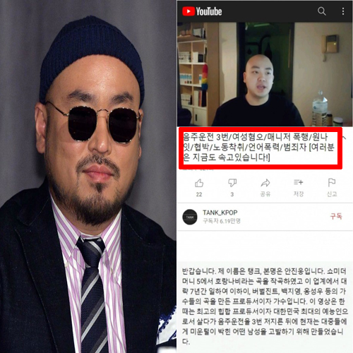 17일 프로듀서 탱크(본명 안진웅)가 운영 중인 유튜브 채널 'TANK_KPOP'(탱크 케이팝)에 '음주운전 3번/여성혐오/매니저 폭행/원나잇/협박/노동착취/언어폭력/범죄자 [여러분은 지금도 속고 있습니다!]'라는 제목의 영상이 게재되었습니다.