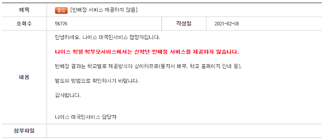 그러나 나이스 측은 지난 8일 반배정 서비스를 제공하지 않는다고 밝혔습니다. 나이스는 이날 공지사항을 통해 "나이스 학생·학부모서비스에서는 신학년 반배정 서비스를 제공하지 않는다"고 설명했습니다.