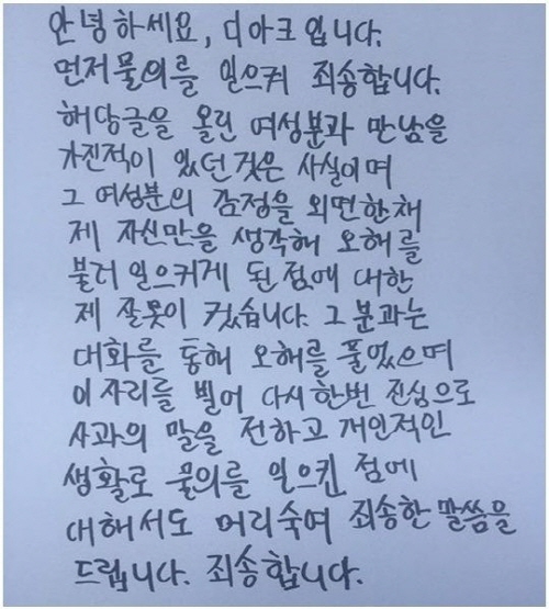 이후 디아크는 "해당글을 올린 여성분과 만남을 가진 적이 있던 것은 사실"이라며 "그분과 대화를 통해 오해를 풀었다. 다시 한번 죄송하다"고 해명했습니다.