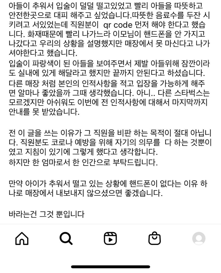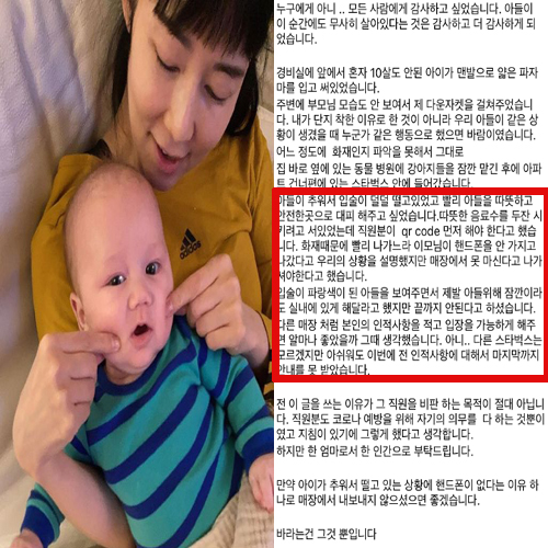 그러면서 위급상황에서 대피할 곳을 찾아간 카페에서 일어난 일도 적었는데요, 사유리는 "아파트 건너편에 있는 카페에 들어갔다, 아들이 추워서 덜덜 떨고 있었고 따뜻하고 안전한 곳에 있게 해주고 싶었는데 직원이 QR코드를 먼저 해야 한다고 했다. 급하게 나오느라 이모님이 휴대전화를 안 가지고 나왔다고 우리 상황을 설명했지만, 그럼에도 매장에서 못 마신다고 했다"며 "입술이 파랑게 된 아들을 보여주며 잠깐이라도 실내에 있게 해달라고 했지만 끝까지 안 된다고 하셨다, 다른 매장처럼 실내에 있게 해달라고 했지만 끝까지 안된다고 하셨다, 다른 매장처럼 인적사항을 적고 입장하게 해 주면 얼마나 좋았을까 싶었다"고 했습니다.