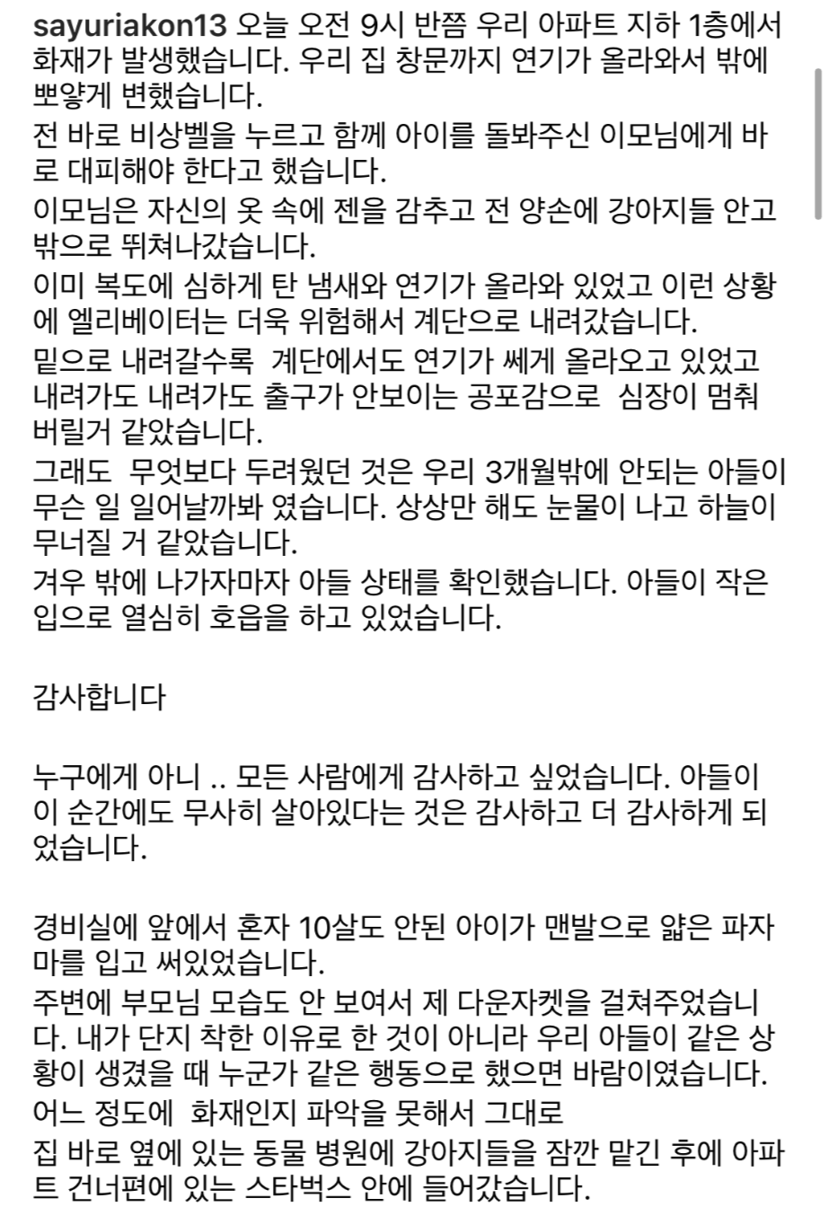 사유리는 23일 인스타그램에 "오늘 오전에 우리 아파트 지하에서 화재가 발생했고, 우리 집 창문까지 연기가 올라왔다"며 "아이를 돌봐주시는 이모님과 함께 대피를 하려고 이모님은 젠을 안고 저는 강아지들을 안고 뛰쳐나갔다"라고 적었습니다.