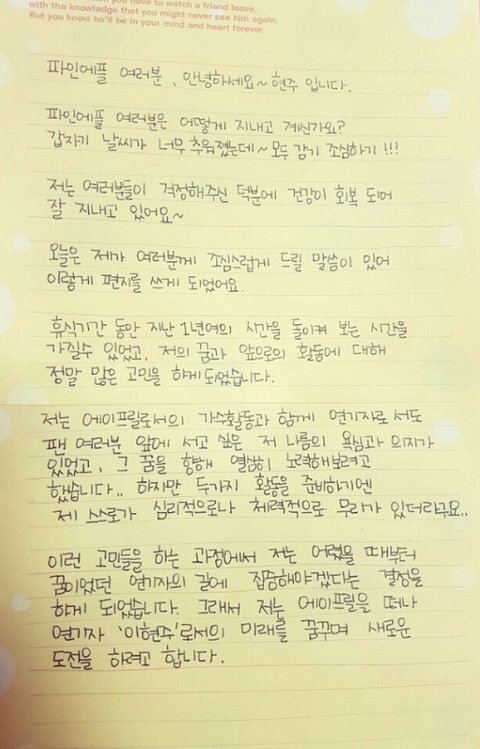 2015년 에이프릴 멤버로 데비한 이현주는 이듬해 10월 "가수 활동과 함께 연기자로서도 팬 여러분 앞에 서고 싶은 저 나름의 욕심과 의지가 있었고 그 꿈을 향해 열심히 노력해보려고 했다. 하지만 두 가지 활동을 준비하기엔 제 스스로가 심리적으로 나 체력적으로 무리가있다"며 에이프릴을 탈퇴했습니다.