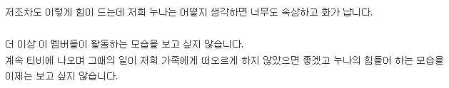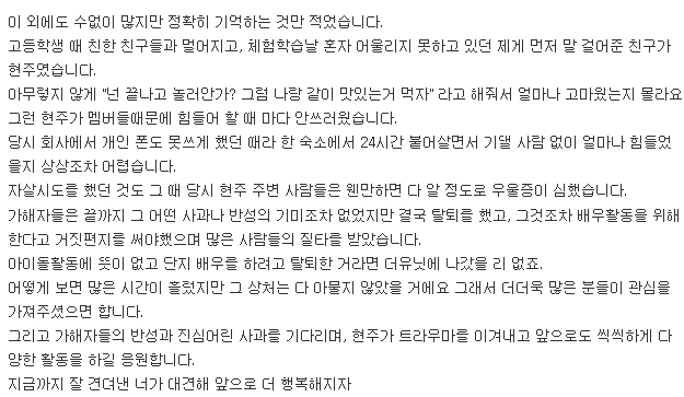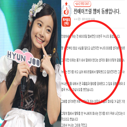 작성자는 "누나의 미래를 생각해 참아왔지만 이제는 용기 내서 말해야 한다는 생각이 들었다"라며 "누나는 연기를 하고 싶어 에이프릴을 탈퇴했다고 알려졌지만 사실이 아니다. 누나는 그룹 내에서 큰 괴롭힘과 왕따를 당해왔고 그 일로 공황장애와 호흡 곤란 등 많이 힘들어했다. 결국 누나는 자살시도를 했었다"고 폭로했습니다.