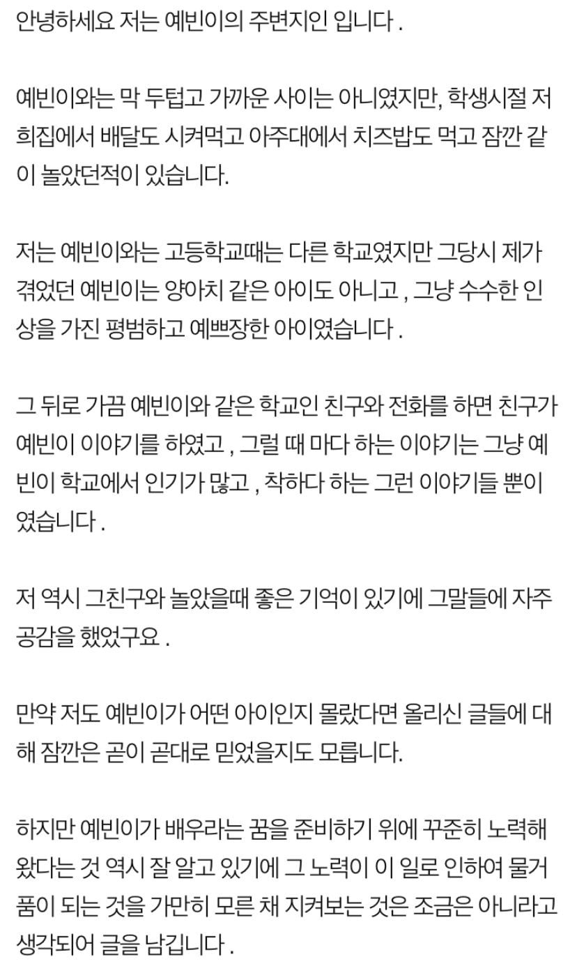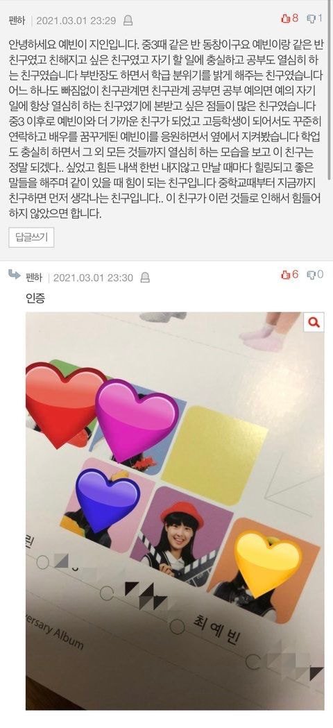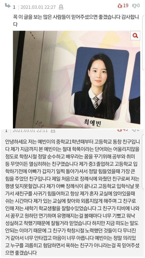 최예빈의 중·고등학교 동창이라고 밝힌 A씨는 "제가 아빠 장례식이 끝나고 고등학교 입학식날 못 가서 새 친구를 사귀기 힘들어하고 항상 제가 혼자 교실에 앉아있을 때 쉬는 시간마다 제가 있는 교실에 찾아와 외롭지 않게 해 주며 그 친구로 인해 저는 새학기 학교 생활을 잘할 수 있었습니다"라며 글을 게재했습니다.