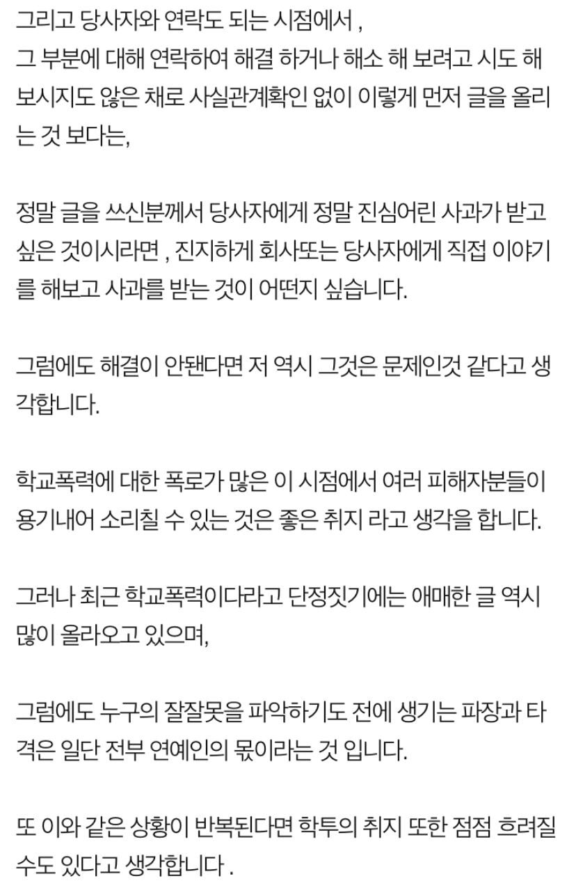 이어 "최초 글이 게시된 후 해당 내용을 인지하게 되었고, 가장 먼저 배우 본인에게 사실을 확인하였습니다. 확인 결과, 글쓴이가 주장하는 내용은 사실과 다름을 알게 되었습니다"라며 "당사는 앞으로도, 해당 일에 대한 내용으로 더이상의 피해자가 발생하지 않도록 최선을 다할 것을 알려드립니다"라고 덧붙였습니다.