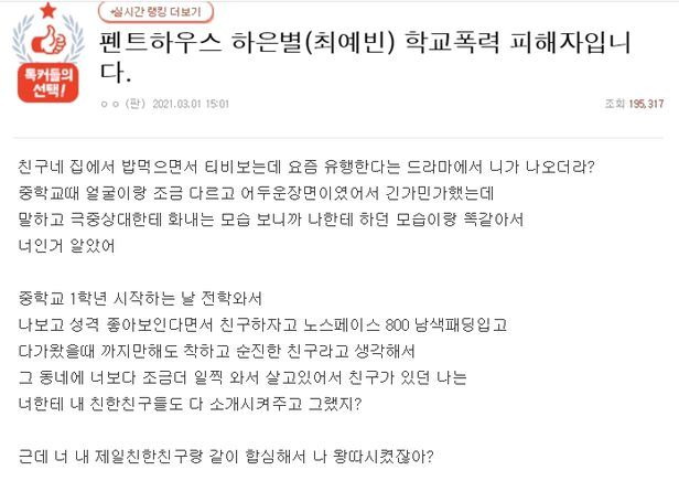 최근 연예계에서 학교폭력 의혹이 잇따라 나타나는 가운데 드라마 '펜트하우스'에 출연 중인 배우 최예빈도 논란에 휩싸였습니다.
