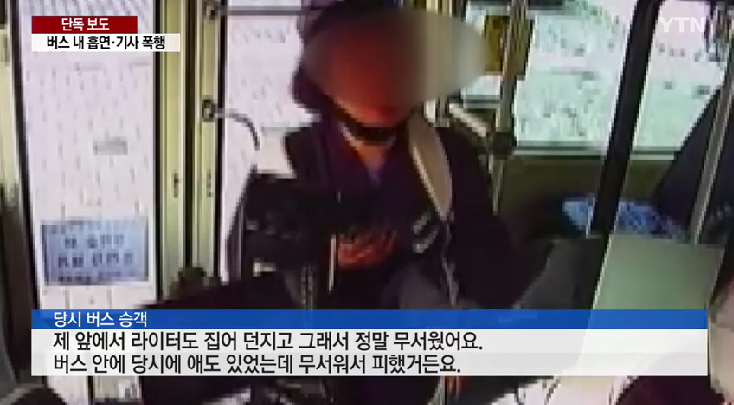당시 버스 승객은 YTN 보도에 "제 앞에서 라이터도 집어던져서 정말 무서웠다"며 "버스 안에 아이도 있었는데 무서워서 다들 피했다"고 말했습니다.