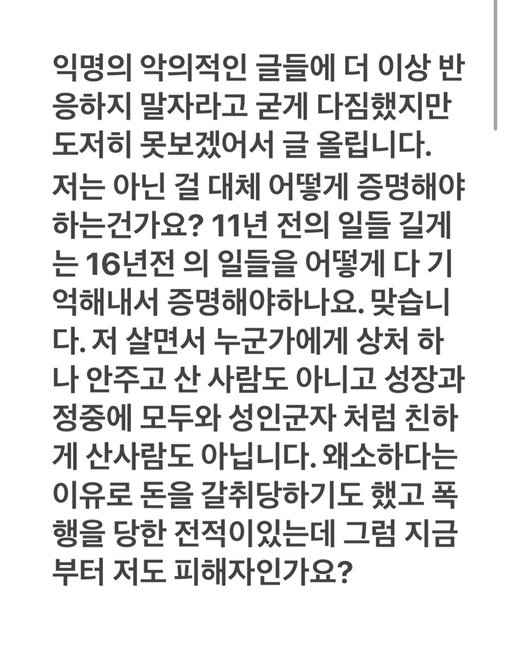 피해자는 조병규 소속사를 향해 "사정상 언급되지 않은 모든 것을 포함한 공개 검증을 제안한다"면서 "고소와 배상을 조합해 사건을 재구성해 진실과 거짓을 바꾸고 사과를 받아야 할 사람이 읍소를 해야하는 이 상황을 어떻게 받아들여야하냐"고 말했습니다.