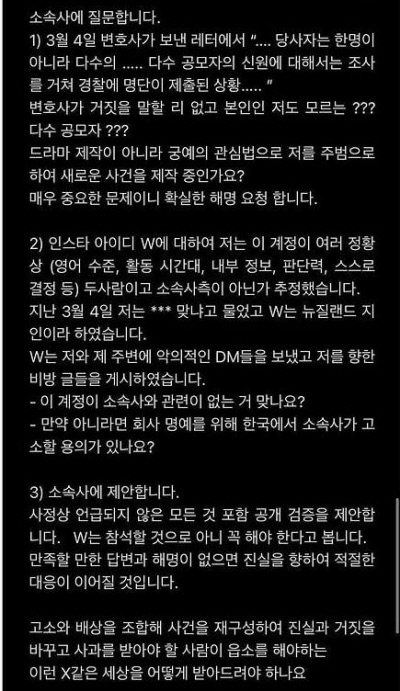 피해 주장자의 주장대로 W가 소속사 인물이라면 앞서 2월에 W가 올린 글 역시 소속사 측에서 동창이라고 속이고 조병규를 옹호하는 글을 게시한 것이 됩니다.