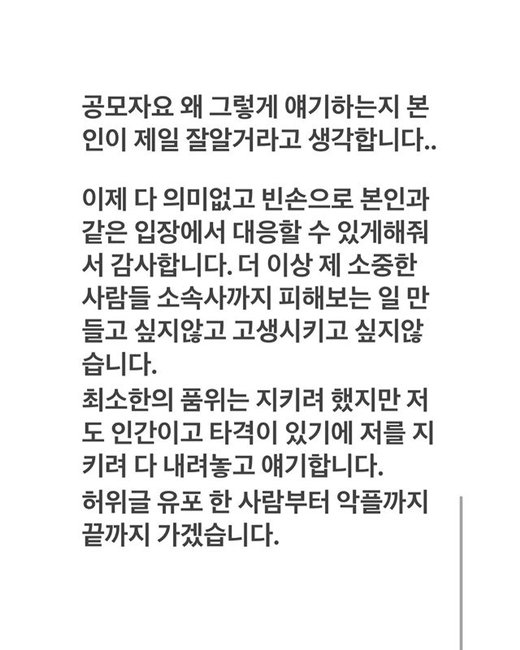 조병규는 "최소한의 품위는 지키려 했지만 저도 인간이고 타격이 있기에 저를 지키려 다 내려놓고 얘기합니다. 허위 글 유포한 사람부터 악플까지 끝까지 가겠습니다"라고 강경대응 방침을 피력했습니다.
