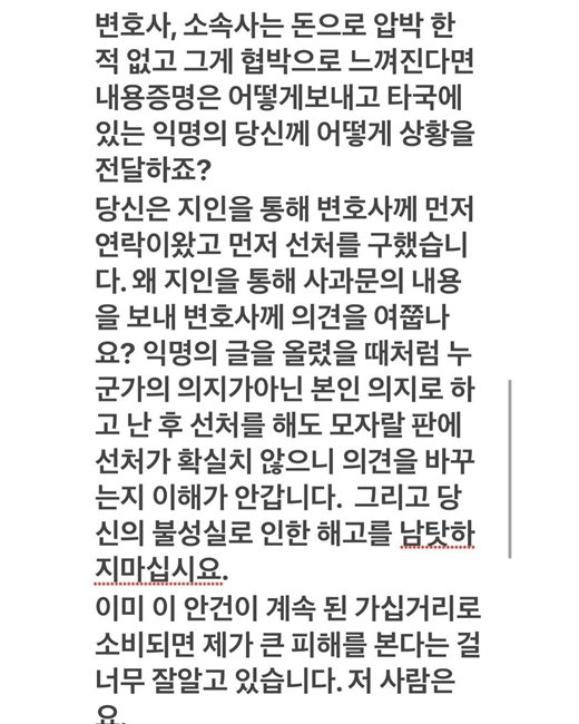 피해자는 "지난달 21일 '게시물을 모두 내리고 사과문을 올려라'는 연락을 받고 일단 모든 게시물을 내렸다"며 "제가 글을 내린 것에 반응하듯 저쪽에서 배우 해명 글을 올린다는 기사가 나왔다"고 말했습니다.