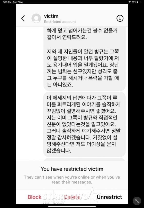 피해 주장자의 글대로 W는 3월 4일에 SNS를 통해 대화를 나누었습니다. 그전에 W는 김**이라며 피해 주장자의 성을 언급해 메시지를 보냈습니다. W가 성(姓)을 알 수 있었던 건 그가 조병규 학폭을 주장하며 올렸던 게시물에 이름이 노출된데 따른 것으로 보입니다.