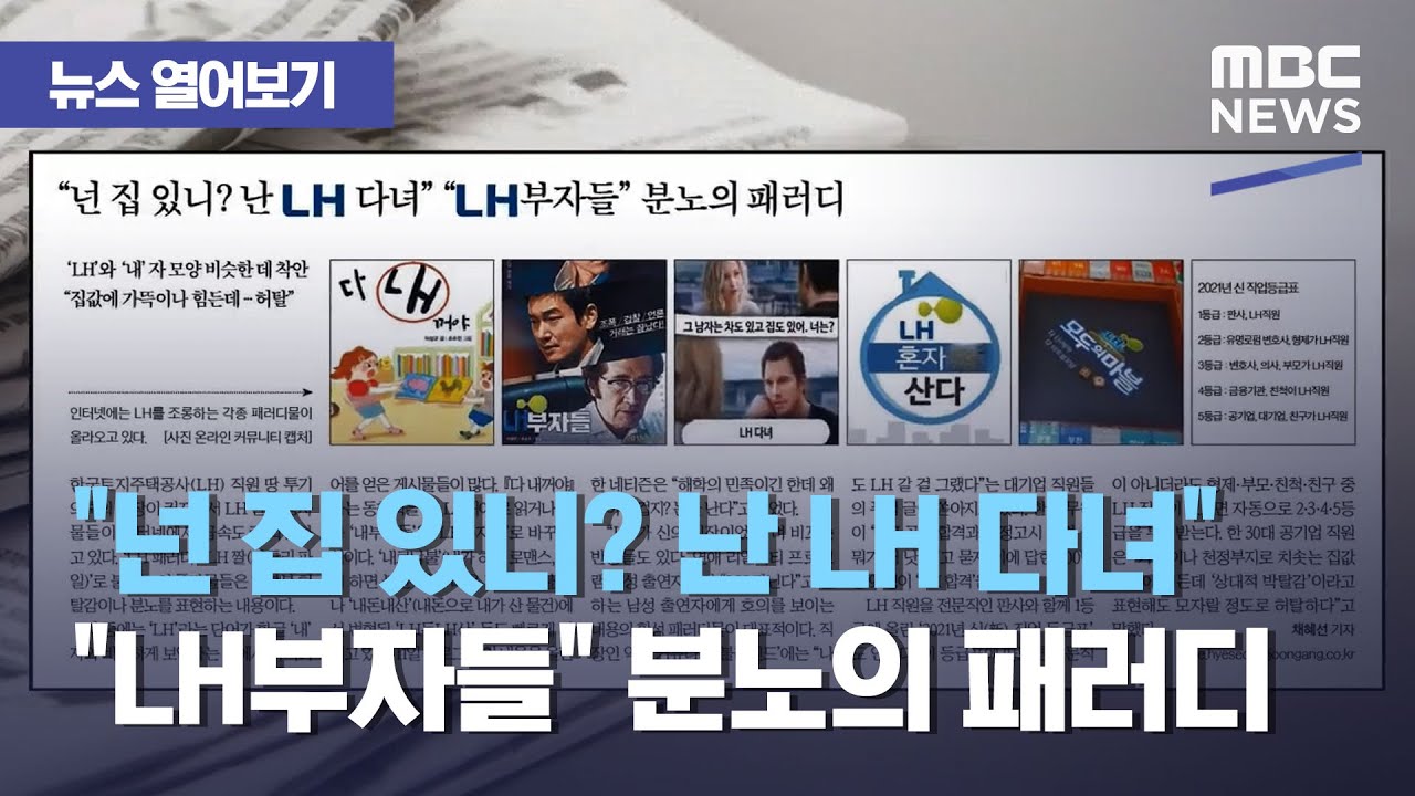 'LH'와 한글 '내'의 표기 모양이 비슷하다는 점에 착안해 만든 다양한 패러디가 나왔는데요, 'LH로남불', 'LH땅LH산', 'LH부자들' 등 LH를 이용해 신조어를 만들어 내기도 했습니다.