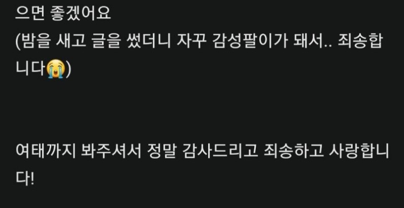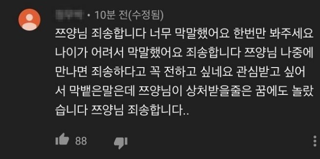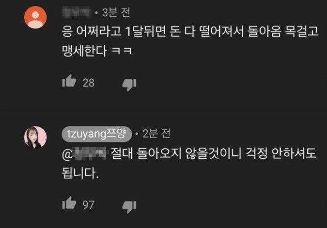 해당 누리꾼은 "응 어쩌라고 1달 뒤면 돈 다 떨어져서 돌아옴. 목 걸고 맹세한다"라고 댓글을 적었는데요, 이에 쯔양은 해당 누리꾼의 글에 "절대 돌아오지 않을 것이니 걱정 안 하셔도 됩니다"라는 댓글을 남겼습니다. 이후 자신의 글을 쯔양이 직접 봤다는 것에 놀랏는 지, 누리꾼은 바로 태세를 전환해 쯔양을 향해 사과를 했습니다. 누리꾼은 "쯔양님 죄송합니다. 너무 막말했어요. 한 번만 봐주세요. 나이가 어려서 막말했어요. 쯔양님 나중에 만나면 죄송하다고 꼭 전하고 싶네요. 관심받고 싶어서 막 뱉은 말인데 쯔양님이 상처 받을 줄을 꿈에도 몰랐습니다"라고 사과했습니다.