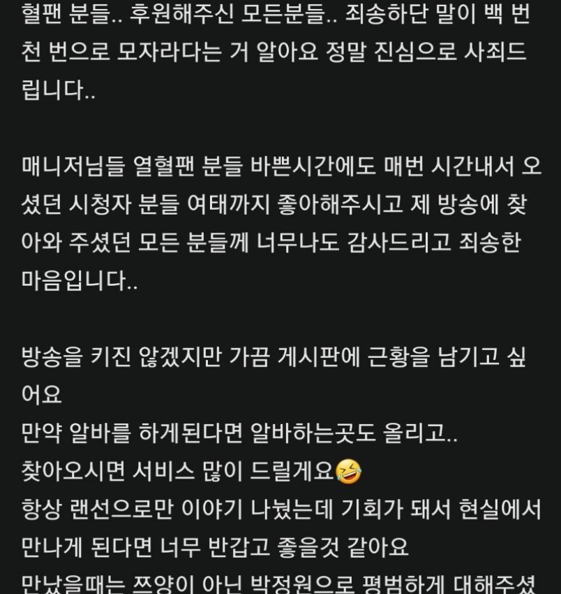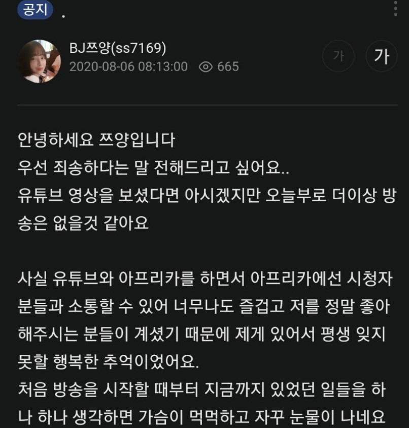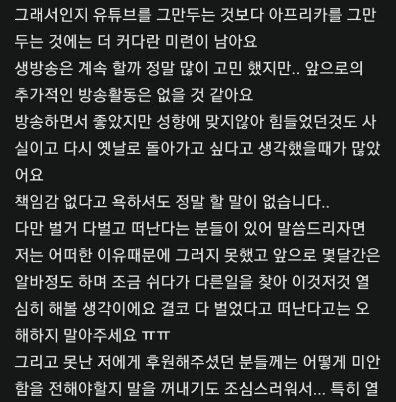 쯔양은 방송을 그만두는 이유에 대해 "제가 저지른 잘못에 대한 질타가 아닌 '몰래 뒷광고를 해왔다', '탈세를 해왔다', '사기꾼' 등 허위 사실을 퍼트리는 댓글 문화에 지쳐 앞으로 더 이상 방송 활동을 하고 싶지 않다"라고 밝혔습니다.