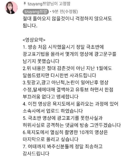 쯔양은 먼저 '뒷광고' 논란과 관련해 "방송을 시작한 지 얼마 안 됐던 시기에 몇 개의 영상에 광고 표기를 하지 않았다. 이는 명백하게 잘못된 바이며 이에 대해 사과드린다"라고 밝혔습니다.