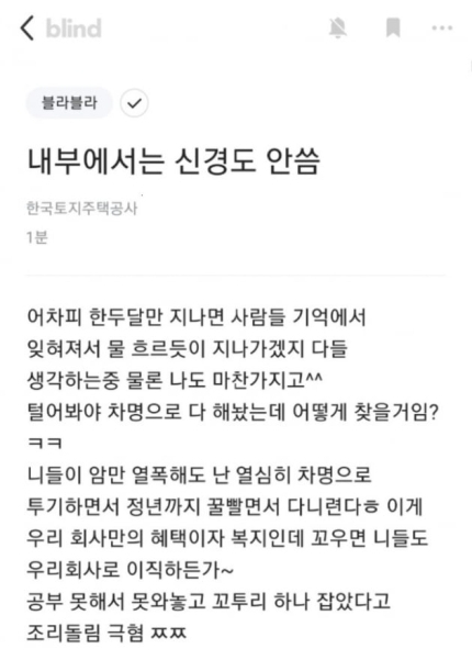 9일 블라인드에는 '내부에서는 신경도 안 씀'이라는 제목의 글이 올라옸는데요, "털어봐야 다 차명으로 해놨는데 어떻게 찾을 거냐. 너희가 아무리 열폭을 해도 난 열심히 차명으로 투기하면서 정년까지 꿀 빨면서 다니련다"라고 했습니다.