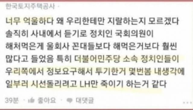 한국토지주택공사(LH) 직원들의 광명·시흥 3기 신도시 투기 의혹이 확산되는 가운데, 한국토지주택공사(LH) 내부 직원으로 추정되는 직원이 조롱글을 올려 논란이 되고 있습니다.
