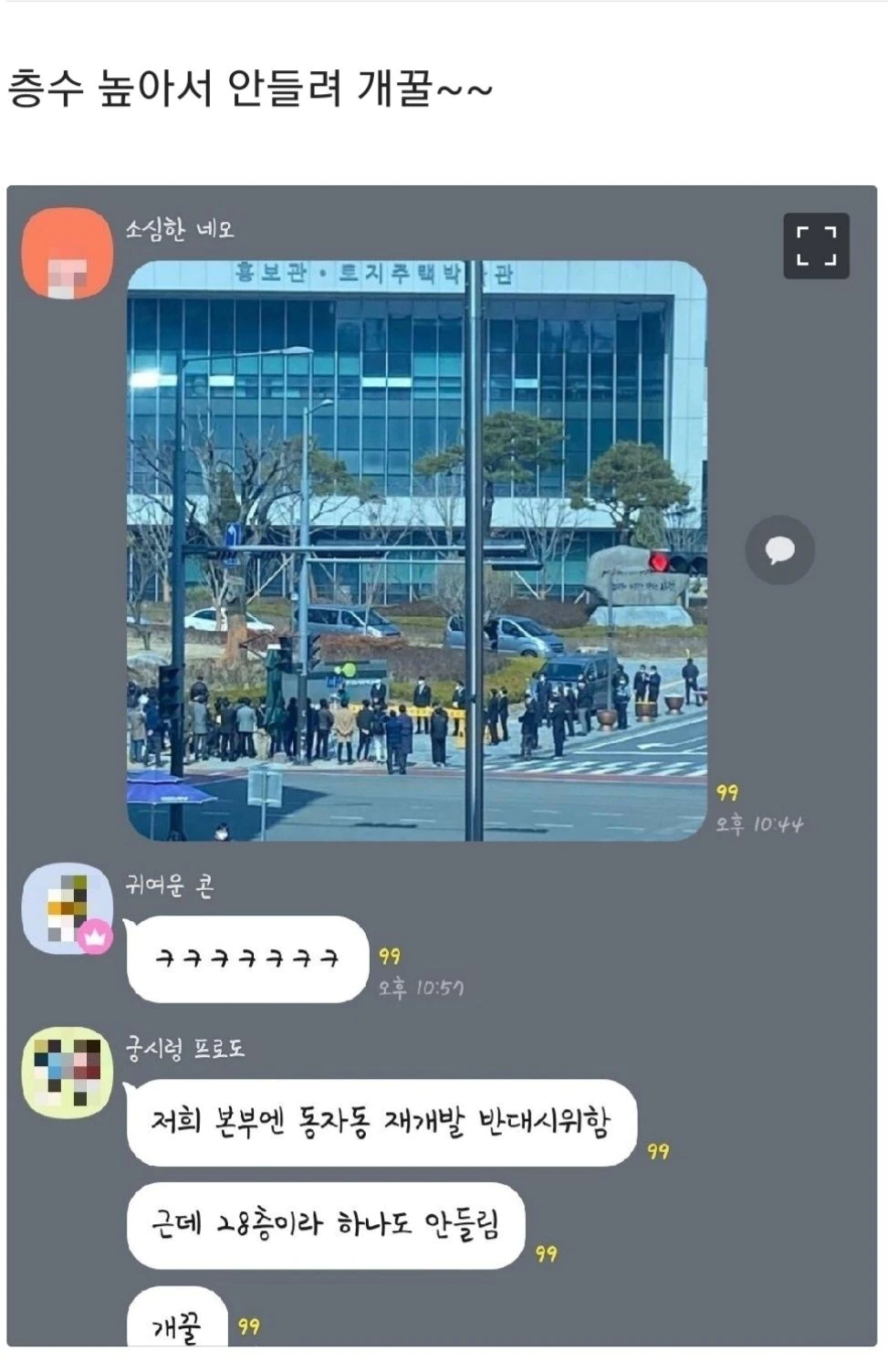 지난 8일에는 블라인드에 LH직원으로 추정되는 A 씨가 동료들과 함께 있는 모바일 메신저 대화방에 경남 진주 LH 본사 앞을 촬영한 사진을 올렸는데요, 그러면서 '층수 높아서 안 들려 개꿀~'이라는 글을 게재했습니다.