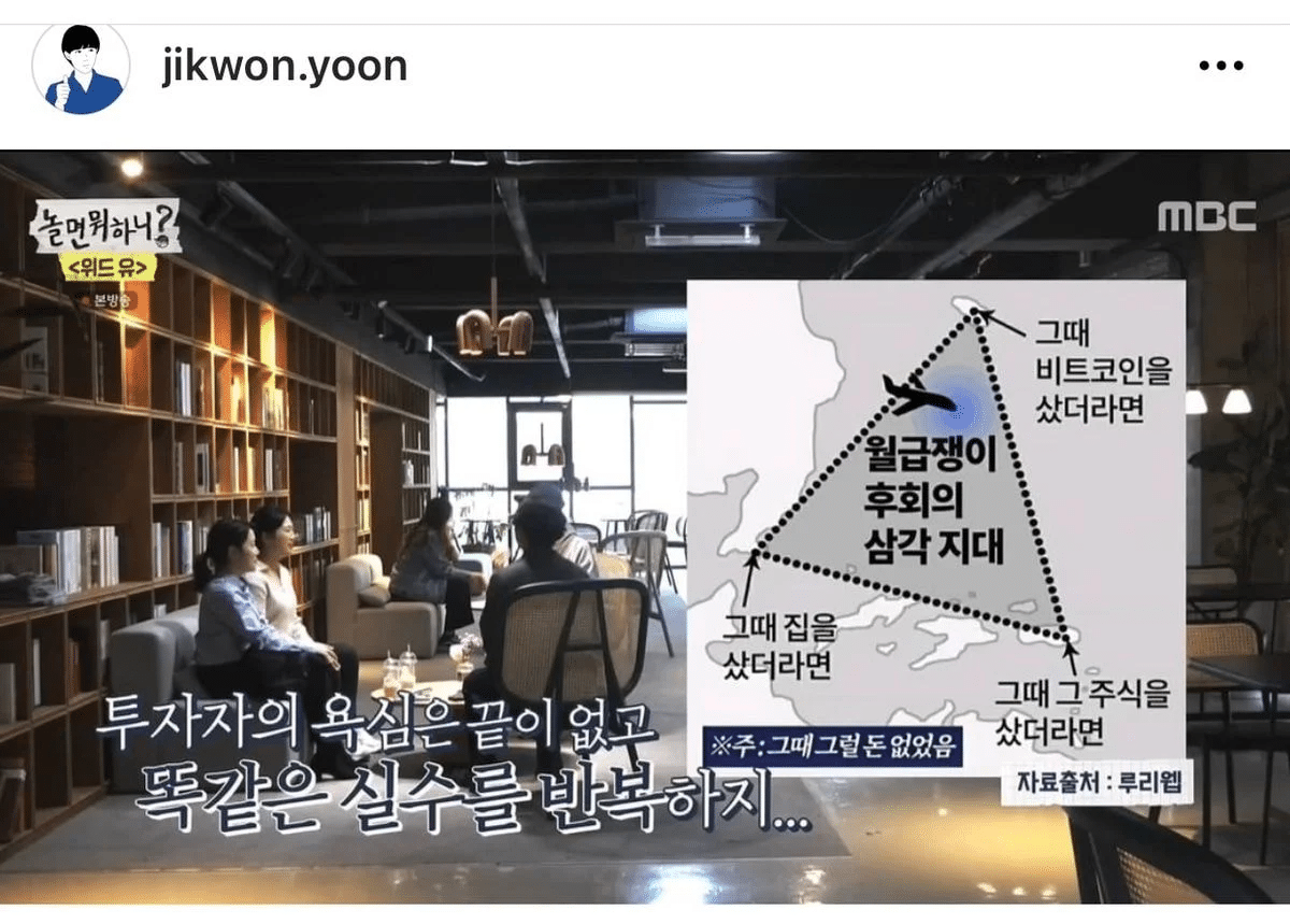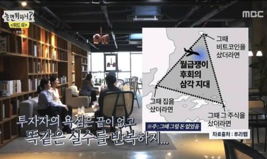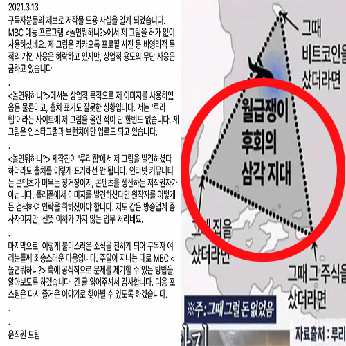 지난 13일 방송된 '놀면 뭐하니?' 84회는 '위드유' 편으로 꾸며졌는데요, 이날 방송에서는 유재석과 주식 투자자들이 대화를 나누는 장면에서 '월급쟁이 후회의 삼각지대'라는 이미지가 사용되었습니다. 해당 이미지의 사용 출처는 '루리웹'으로 표기되었습니다.