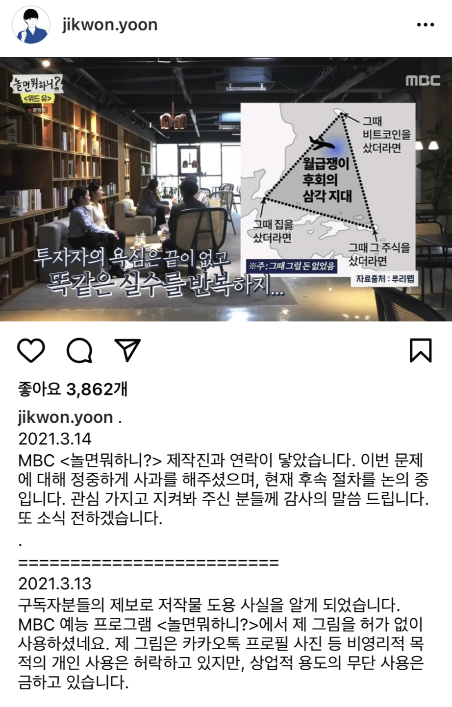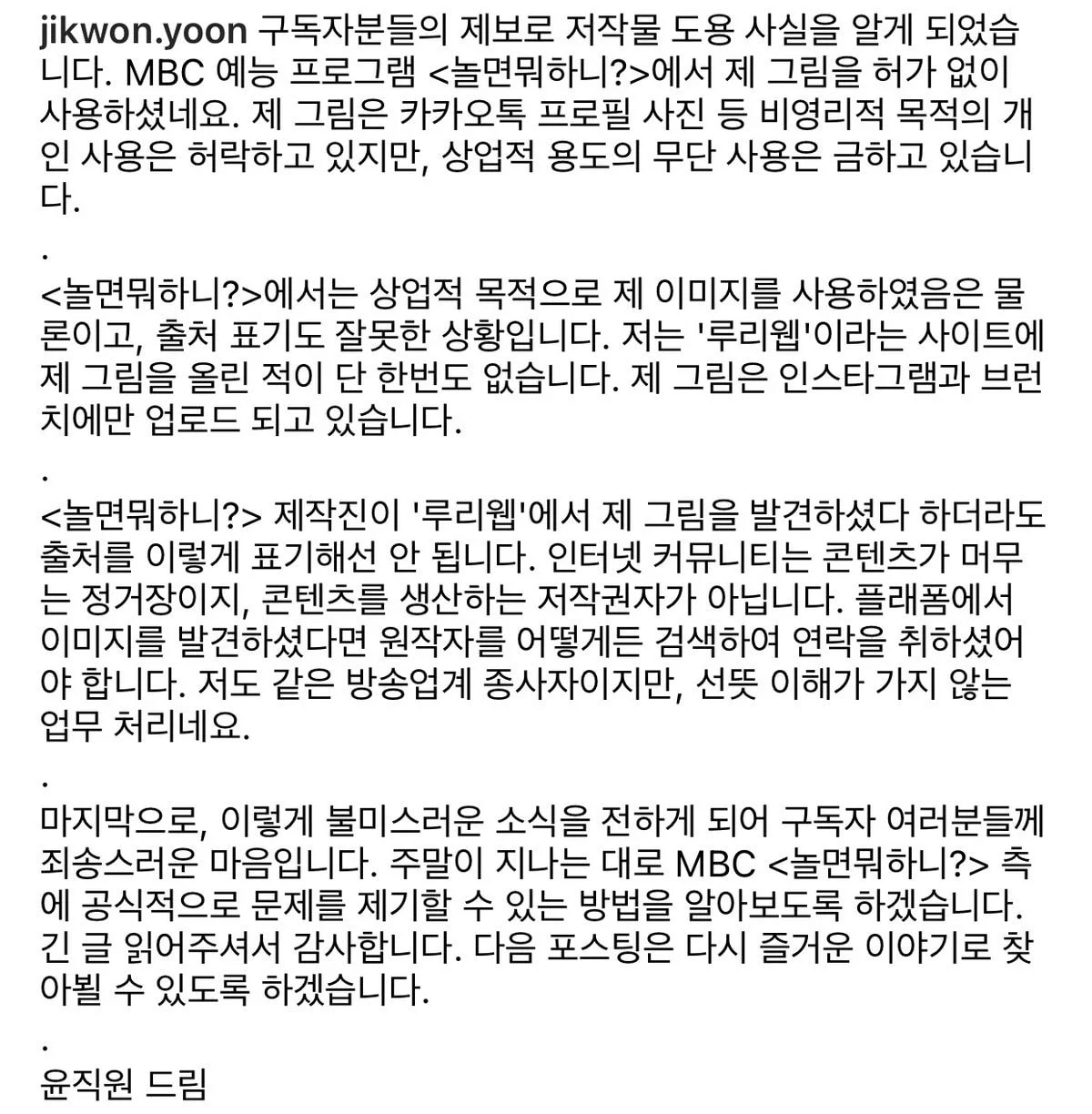 이어 "'놀면뭐하니'에서는 상업적 목적으로 내 이미지를 사용하였음은 물론이고, 출처 표기도 잘못한 상황이다. 나는 '루리웹'이라는 사이트에 내 그림을 올린 적이 단 한 번도 없다. 내그림은 인스타그램과 브런치에만 업로드 되고 있다. 선뜻 이해가 가지 않는 업무 처리"라고 지적했습니다.