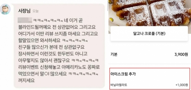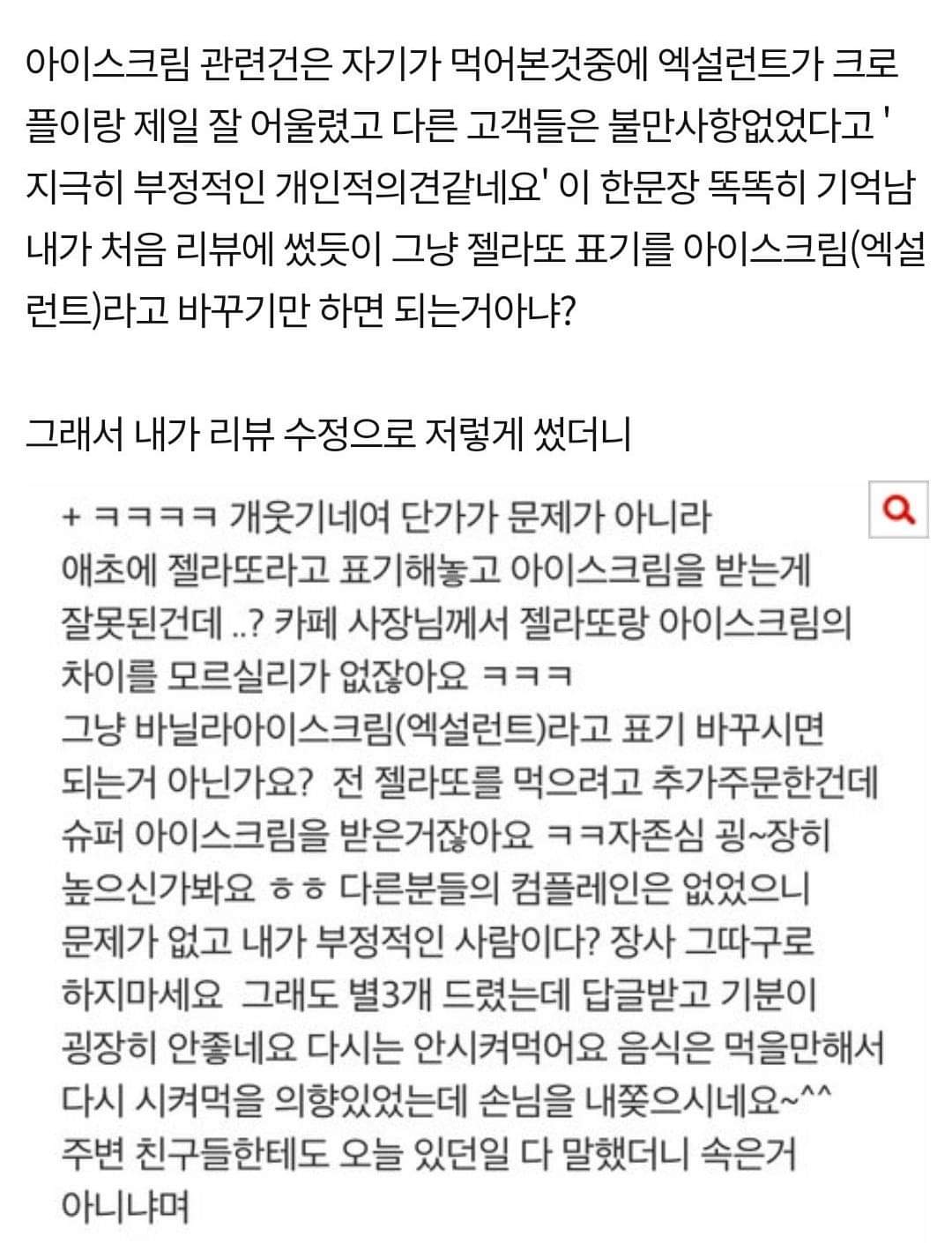 작성자 A씨는 "크로플을 시키며 추가금액을 내고 바닐라 젤라또를 주문했다. 그런데 슈퍼 아이스크림 액설런트 하나가 딱 왔다"고 밝혔습니다. 그리고 A씨는 자신이 작성한 리뷰를 캡쳐해서 올렸습니다.