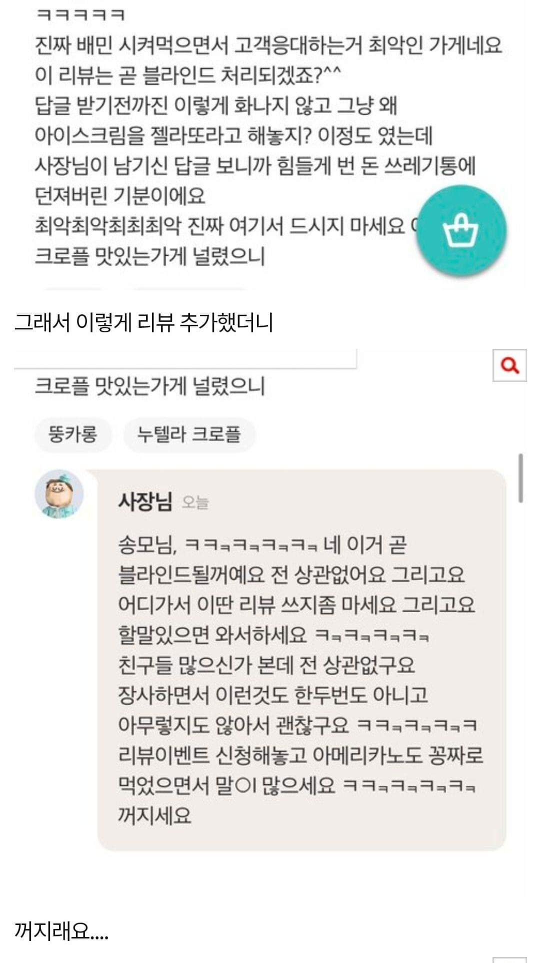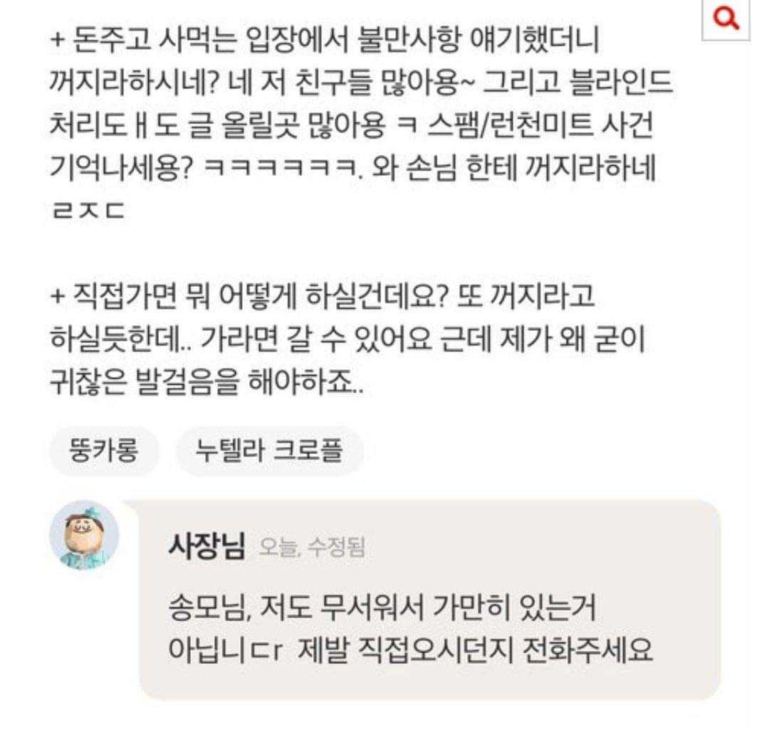 이에 카페 사장은 "미친 XX야 너 죽여버린다. 상동 사는거 다 알고 한 번만 더 해봐"라고 대응하기도 했습니다.