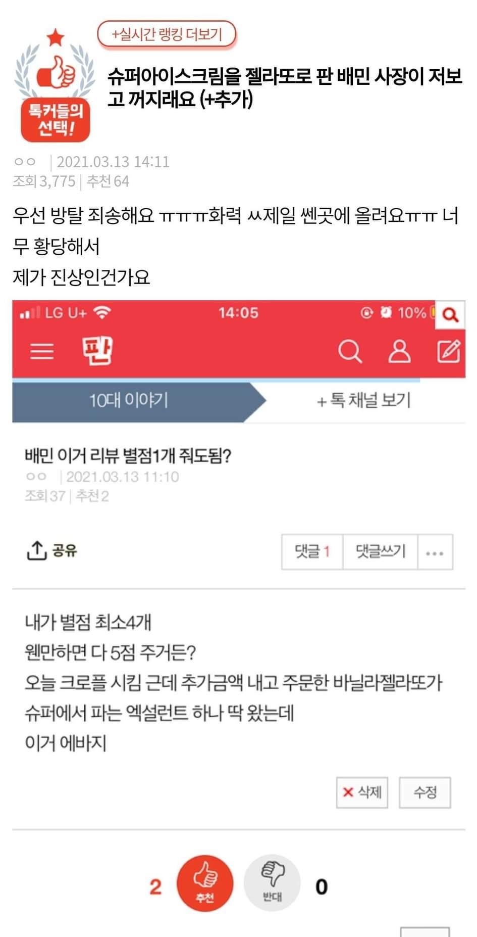 13일 한 온라인 커뮤니티에는 '슈퍼 아이스크림을 젤라또로 판 배민 사장이 저보고 꺼지래요'라는 제목의 글이 게재되었습니다.