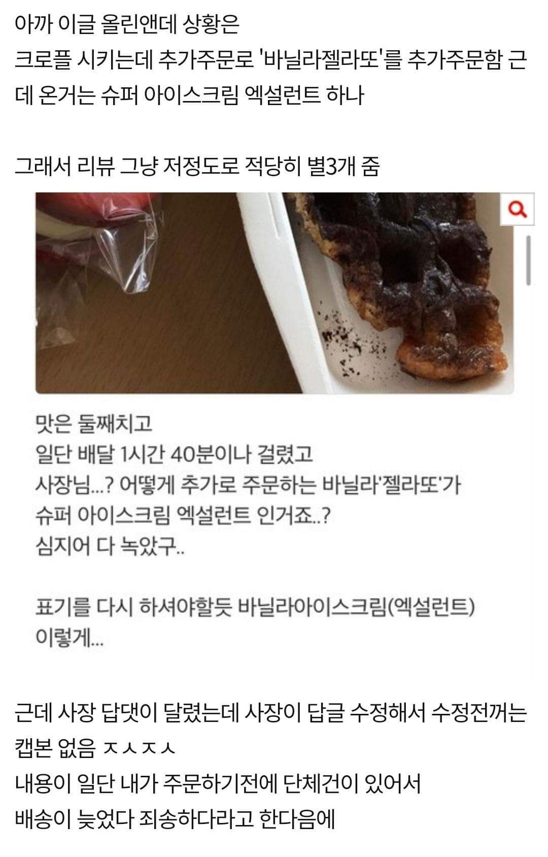 작성자 A씨는 "크로플을 시키며 추가금액을 내고 바닐라 젤라또를 주문했다. 그런데 슈퍼 아이스크림 액설런트 하나가 딱 왔다"고 밝혔습니다. 그리고 A씨는 자신이 작성한 리뷰를 캡쳐해서 올렸습니다.