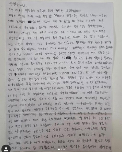 지난달 온라인 커뮤니티 등에서는 치킨 프랜차이즈 철인 7호 부산 본사에 고등학생 A군이 보낸 손편지가 화제가 되었습니다.