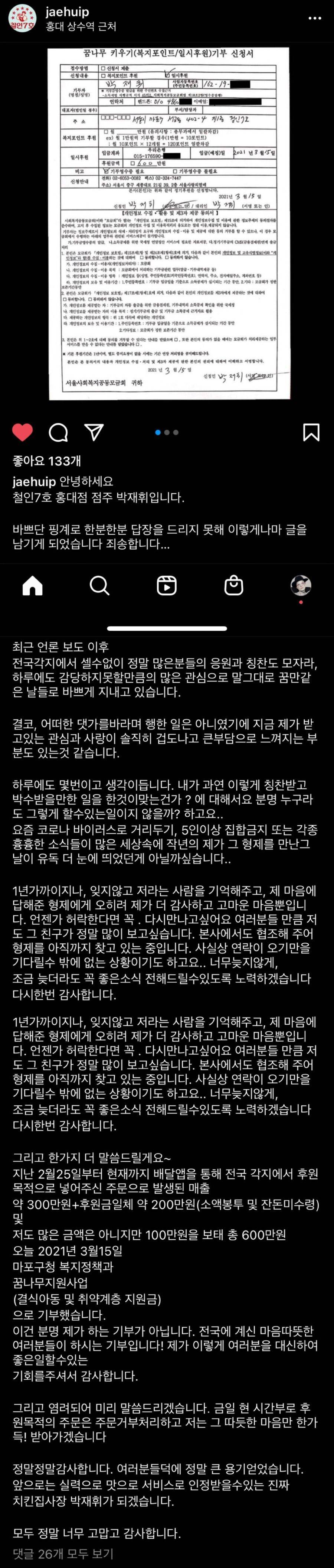 이어 후원 소식도 전했습니다. 박재휘 철인 7호 홍대점 대표는 "지난 2월 25일부터 현재까지 배달앱을 통해 전국 각지에서 후원 목적으로 넣어주신 주문으로 발생된 매출 약 300만 원, 후원금 약 200만 원(소액 봉투 및 잔돈 미수령) 및 저도 많은 금액은 아니지만 100만 원 보태 총 600만 원을 3월 15일 마포구청 복지정챙과 꿈나무지원사업으로 기부했다"고 밝혔습니다.