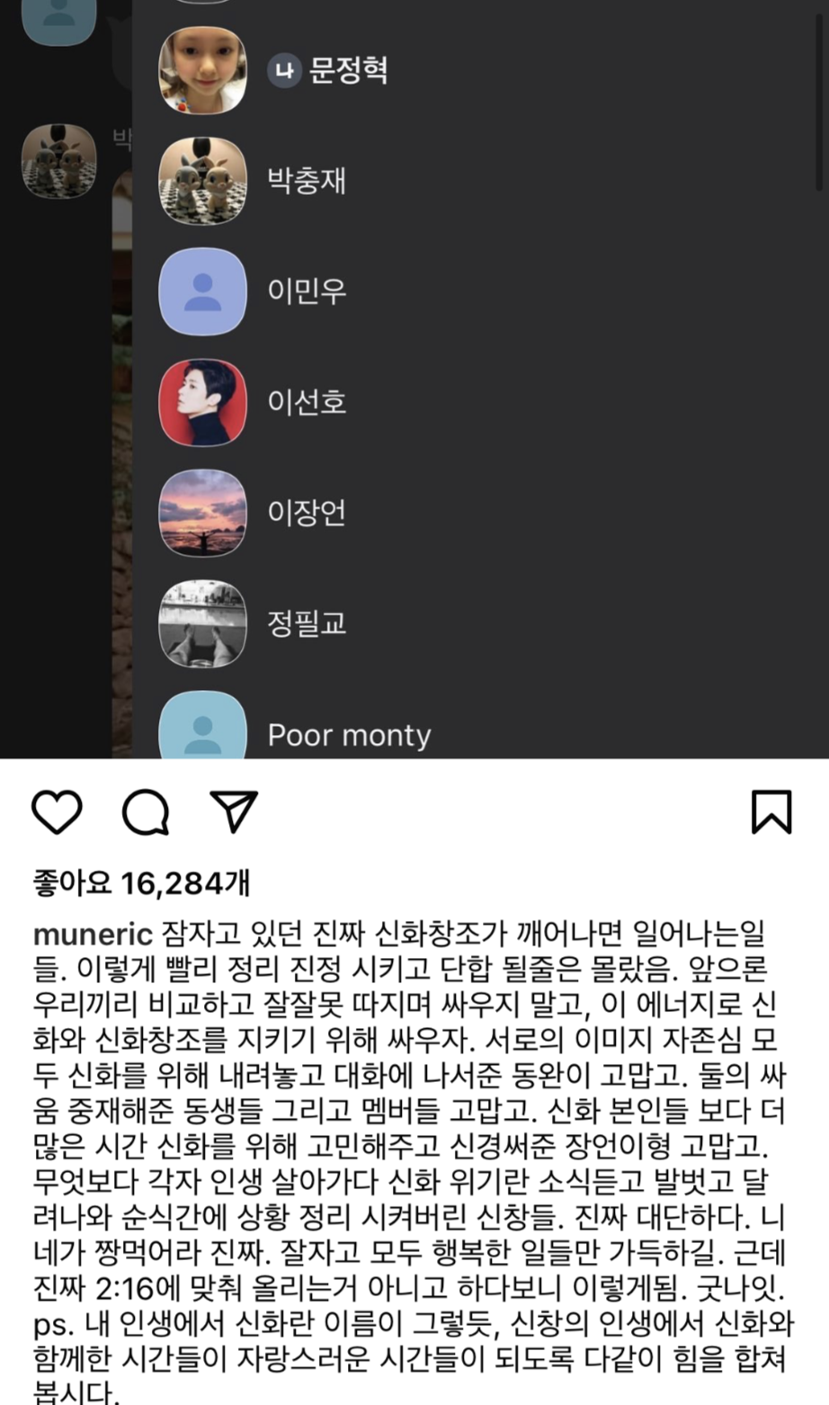 이어 "앞으론 우리끼리 비교하고 잘잘못 따지며 싸우지 말고, 이 에너지로 신화와 신화창조를 지키기 위해 싸우자"라고 전했습니다.