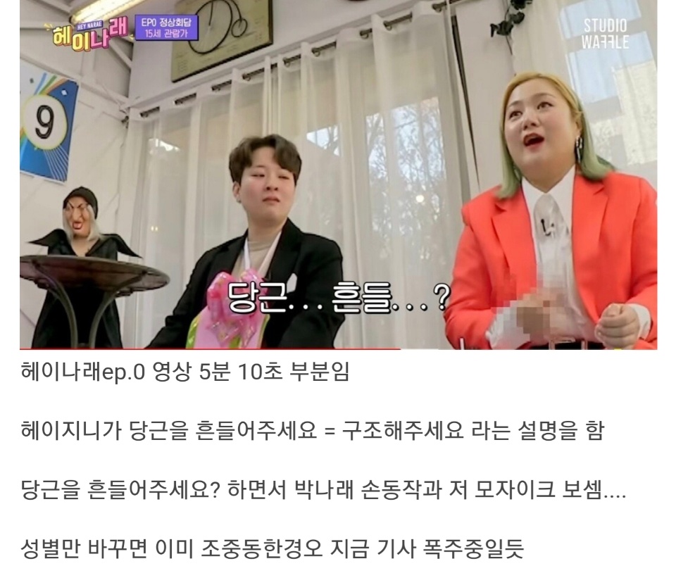 헤이지니가 "저를 좋아하는 친구들이 박나래 언니에게 괴롭힘을 당하면 당근을 흔들며 구조 요청을 하더라"고 말했는데요, 이에 박나래는 "당근을 왜 흔들어?"라며 다리 사이에서 손을 흔들었습니다. 이는 마치 남성들의 자위행위를 연상케 했고 남성 출연자는 인상을 찌푸리기도 했습니다.