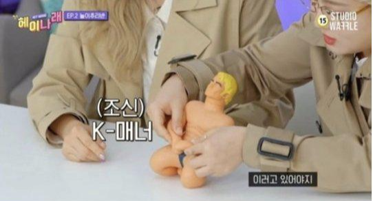 또 인형의 손으로 신체 주요 부위를 가리자, 제작진은 이를 '(조신) K-매너'라는 자막을 쓰기도 했습니다. 이 같은 행동에 헤이지니는 "25금 아니냐"며 당황스러운 반응을 보이기도 했습니다.
