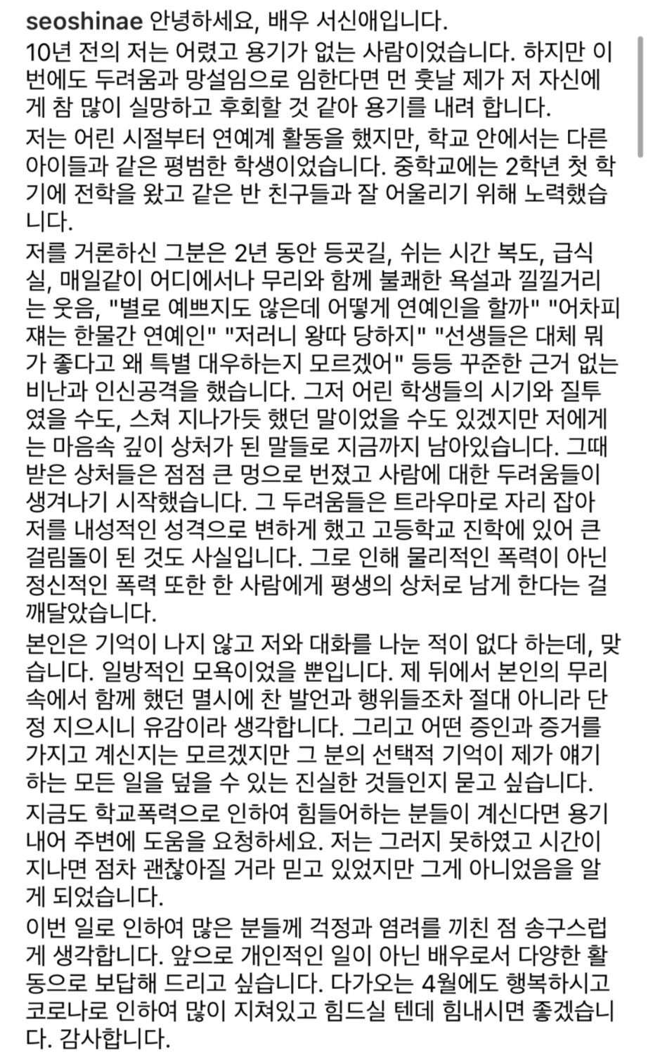 서신애는 26일 자신의 인스타그램을 통해 과거 (여자)아이들 수진으로부터 2년간 욕설과 인신공격을 당했다고 밝혔습니다.