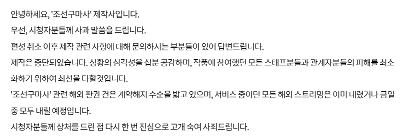 26일 SBS는 "이번 사태의 심각성을 깊이 인식하여 '조선구마사' 방영권 구매 계약을 해지하고 방송을 취소하기로 결정했다"고 발표했습니다.