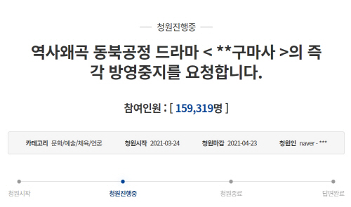 그러나 최근 중국이 김치 한복 등을 중국 것이라고 우기는 '문화 동북공정'이 심해지며 국내에 반중 정서가 거센 가운데 조선구마사는 결국 폐지가 결정되었습니다.